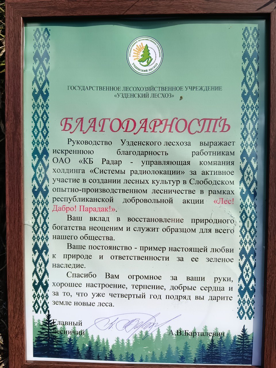Натхнёныя ідэяй аднавіць лясы, пацярпелыя пасля стыхіі, работнікі ААТ «КБ Радар» высадзілі 3000 саджанцаў хвоі звычайнай і бярозы павіслай на плошчы 1,1 гектара ў Слабадскім доследна-вытворчым лясніцтве дзяржаўнай лесагаспадарчай установы «Уздзенскі лясгас».
