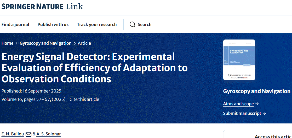 На онлайн-платформе SpringerLink прадстаўлены том №16-2025 аўтарытэтнага навуковага часопіса «Gyroscopy and Navigation» (Гіраскапія і Навiгацыя), у якім супрацоўнікамі ААТ «КБ Радар» Саланаром А.С. і Буйловым Е.М. апублікаваны артыкул «Energy Signal Detector: Experimental Evaluation of Efficiency of Adaptation to Observation Conditions» («Эксперыментальная ацэнка эфектыўнасці адаптацыі да ўмоў назірання энергетычнага выяўляльніка сігналу», https://link.springer.com/article/10.1134/S2075108725700154).
